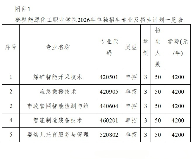 鹤壁能源化工职业学院2026年单独考试招生计划